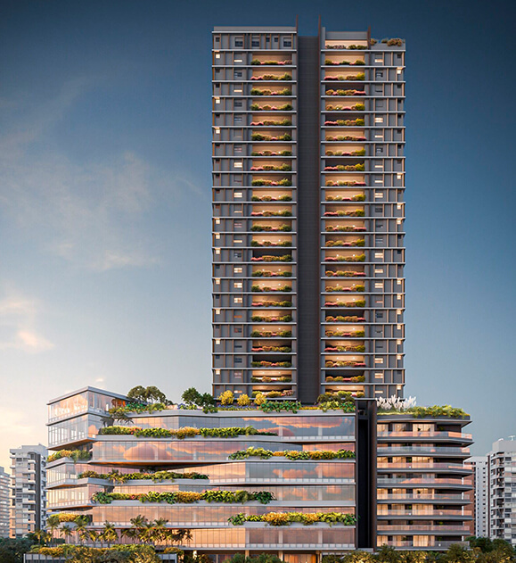 ”A implantação da torre é um importante diferencial. Sua posição elevada, posicionada ao centro do terreno, permitiu criar um grande recuo e visão privilegiada para todos os apartamentos. Outro diferencial é a flexibilidade das plantas favorecendo ambientes amplos e com incidência de luz natural.